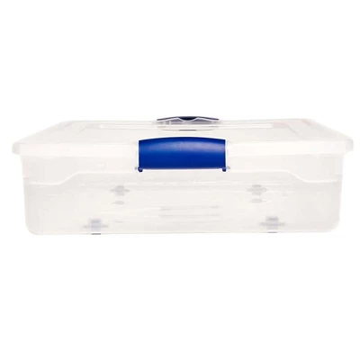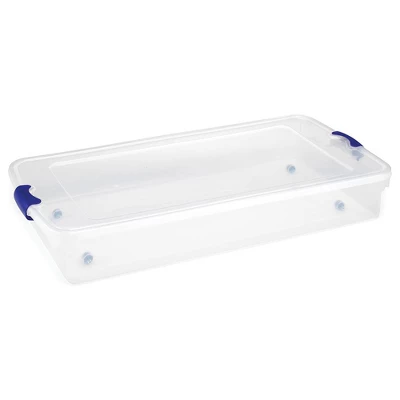 Get the most out of your space with the 2-pack of Homz 60-Quart Underbed Secure Latching Plastic Storage Containers, the perfect solution for protecting holiday decorations, out-of-season clothing, and more from dust and debris. Take pride in your organizational skills and show off your tidy space thanks to these large bins. With a spacious 60-quart capacity and secure latching handles, these storage containers keep various items safe and sound. It’s not always easy to keep track of stored items, but courtesy of the see-through design, you can quickly identify storage contents without the hassle of opening each container. Take your tote on the go using the ergonomic carrying handles while the modular design optimizes storage space, allowing you to stack and nest each bin. For out-of-the-way storage space, you can easily glide these totes under your bed with the smooth rolling wheels. Take your home or office storage organization to the next level with the 2 60-Quart UnderBed Secure Latching Plastic Containers from Homz.