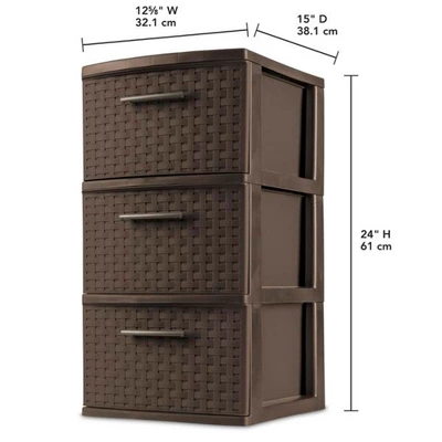 Attractive household storage container furniture around your home shouldn’t have to cost a lot. The Sterilite 3 Drawer Weave Tower is both an efficient storage solution and easy on the eyes. This package includes 6 towers.The attractive wicker design and neutral espresso brown finish complement any home and naturally blends in with your other decor. The driftwood handles make it easy to open and shut the opaque drawers, which keep contents hidden discretely. They go great with any decor style and work well in living rooms, bedrooms, bathrooms, offices, or closets. At 15 inches wide by 24 inches tall, it’s large enough to store books, DVDs, or random household items and doubles as a coffee table or bedside table. If you need more storage room in your space and don’t want to lose your interior style, you’ll love to have the Pack of 6 3 Drawer Weave Towers from Sterilite.