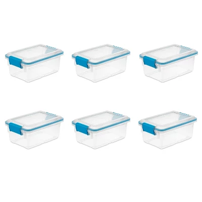 Need help getting organized? These Sterilite 7.5-Quart Clear Storage Containers will help you with your moving or storage needs. This package includes 6 storage bins and lids.These durable storage totes feature a 7.5-quart capacity and are an ideal solution for keepsakes, photographs, important documents, linens, clothing, and other items that need to be stored away and protected. The latching lid attaches to the base to ensure your belongings stay safe and secure during a move or while in storage. The gasket seals both air and moisture, keeping those special belongings safe from the elements, dust, and pests. Durable, tight-fitting latches keep the lid secured to the base, and the clear lid and base allow contents to be easily identified, without opening the lid.Quality is key when it comes to choosing storage materials. That’s why these Sterilite 7.5-Quart Clear Storage Containers are crafted from durable plastic to keep your possessions protected.
