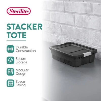 Tackle household storage with confidence using the Sterilite Modular Stacker Line, designed to bring order to busy spaces like closets, garages, attics, sheds, basements, and utility rooms.Available in 4-, 7.5-, 10-, 19-, 27-, and 50-Gallon sizes, these durable storage totes offer a flexible, modular system that adapts to your needs. Whether you’re sorting hand tools, Christmas tree ornaments, Halloween decor, pantry overflow, seasonal items, pet gear, or crafting supplies, there’s a size to suit everything from the everyday to the occasional. The deep indexed surface of the lids allows multiple totes to stack securely, helping you maximize vertical space while maintaining a consistent footprint across several sizes. Rugged latches snap tightly to keep the lid secured to the base, while the textured surface provides a reliable grip when carrying or shifting containers around. The opaque body keeps contents discreetly out of sight, while still allowing for intuitive organization throughout your home.Supporting both short-term storage and long-term safekeeping, these totes are made from BPA-free plastic that holds up to daily use in a range of environments. The lid design is shared across select sizes, allowing shallow and deep totes to interlock neatly together for a streamlined system. With multiple sizes and pack options available, the Sterilite Stacker Tote line helps create a uniform, durable storage solution that’s easy to build, scale, and rearrange.