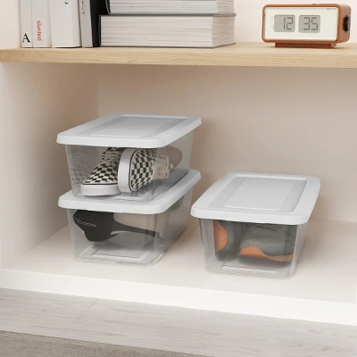 Transform your home organization with the Sterilite 6 Quart Clear Storage Box, the perfect solution for keeping your living spaces neat and clutter-free. Whether you’re storing shoes, accessories, crafts, or small household items, this versatile storage box provides a simple yet efficient way to bring order to your home. The clear base allows for easy identification of contents at a glance, eliminating the need to dig through boxes to find what you’re looking for. The opaque lid snaps securely onto the base, ensuring your items stay contained and protected. Plus, the lid features a convenient grip for easy lifting.Designed with space efficiency in mind, the recessed lid allows multiple boxes of the same size to stack securely on top of one another, maximizing your vertical storage space. This makes it ideal for closet shelving, and it fits perfectly on 16-inch wire closet shelves. When storing, be mindful not to overload the boxes or stack them too high; placing the heaviest box at the bottom will help maintain balance and stability.Proudly made in the USA, this storage box is BPA-free and phthalate-free, ensuring a safe and reliable storage solution for your home. The overall dimensions of the Sterilite 6 Quart Storage Box are 13 5/8″ L x 8″ W x 4 5/8″ H, making it compact enough to fit neatly in closets, cabinets, and other storage spaces. Bring order to your home today with the Sterilite 6 Quart Clear Storage Box!